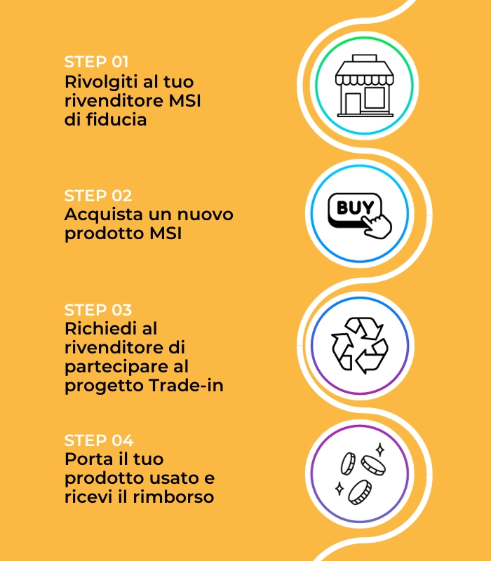 Con MSI Trade In puoi ricevere un credito per il tuo vecchio dispositivo e scalarlo subito dal tuo acquisto. E se il tuo dispositivo non ha più valore di permuta, ci occupiamo noi di riciclarlo a costo zero. È un bell’affare per te, e anche per il pianeta.